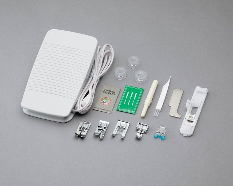 - różne stopki: do wszywania zamków, frędzli, tasiemek, pereł, kordonka, wypustek również z bizą, sznurka, z rolką, do rolowania, podwijania, marszczenia, z linijką, do patchworku, do patchworku z prowadnikiem, z centralnym prowadnikiem do łączenia tkanin, do quiltingu, krawędziowa, teflonowa, do przyszywania aplikacji, obcinacz krawędzi, prowadnik krawędziowy, lamownik i stopka z górnym transportem.