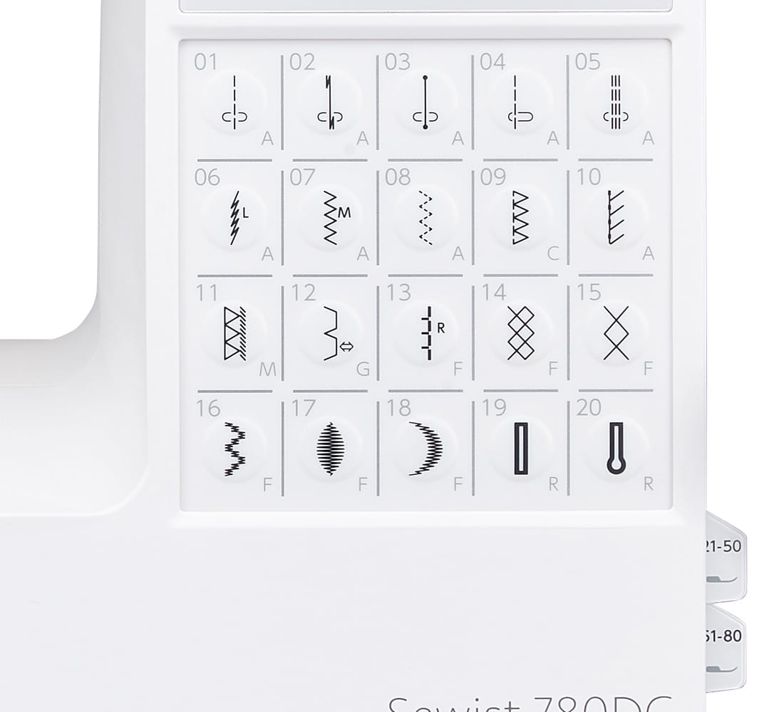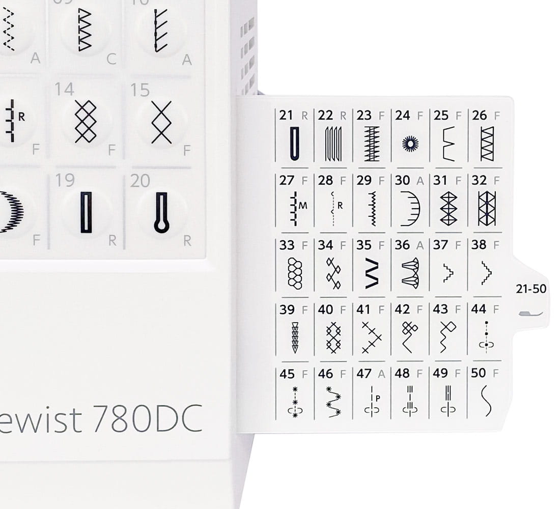 Janome 780DC została wyposażona w 80 programów ściegowych. Wśród których znajdziesz ściegi użytkowe (ścieg prosty, zygzak, elastyczny (do szycia dzianin), kryty, ścieg owerlokowy), ściegi do naszywania aplikacji, piękne ściegi dekoracyjne (z funkcją wydłużania ściegów satynowych bez utraty ich gęstości, w ten sposób zyskujesz nową formę dekoracji), a także 3 rodzaje automatycznego obszywania dziurek na wymiar guzika.