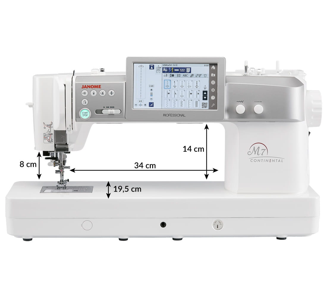 Janome Continental M7 Professional (CM7P) to maszyna z największą powierzchnią do szycia, jej przestrzeń pomiędzy igłą, a ramieniem maszyny wynosi 34 cm, natomiast wysokość od blatu do ekranu maszyny to aż 14 cm. Żadna wieloczynnościowa maszyna nie jest tak duża, a co za tym idzie, tak wygodna w czasie użytkowania.