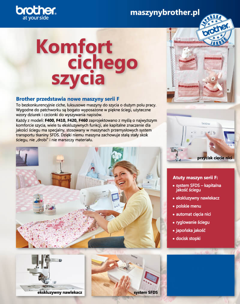 Maszyny serii F są bardzo proste w obsłudze i wyróżniają się wysoką jakością szycia. Jest to idealna maszyna dla tych, którzy przeszli przez etap maszyn prostych i chcą teraz spróbować maszyny z wyższej półki. Jest to też bardzo dobra maszyna do nauki szycia patchworków i quiltingu.