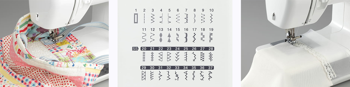 Wzmocniona konstrukcja zapewnia wysoką wytrzymałość maszyny oraz umożliwia przeszywanie grubych materiałów. Wszystkie istotne elementy oraz podzespoły i korpus są metalowe. Oczywiście maszyna bardzo dobrze sobie radzi także z cienkimi materiałami. Posiada 37 ściegów (dostępne są ściegi ozdobne!) płynną regulację szerokości i gęstości ściegu oraz potrafi robić automatyczne dziurki.