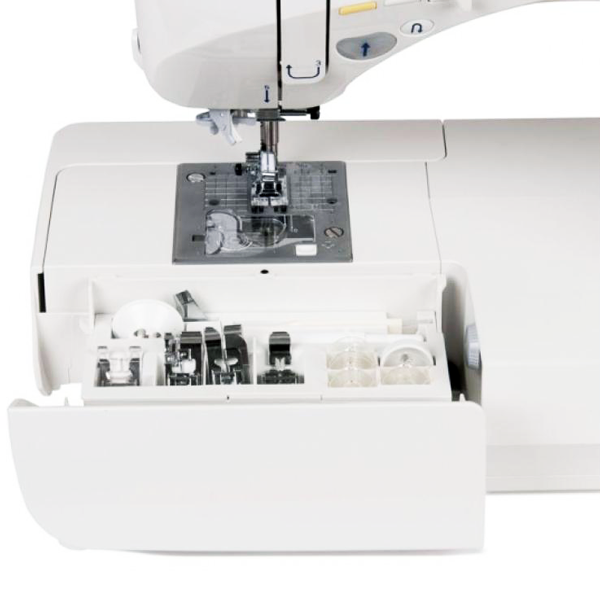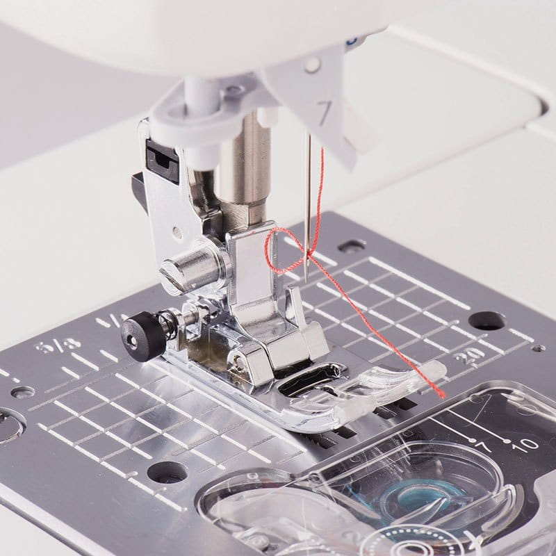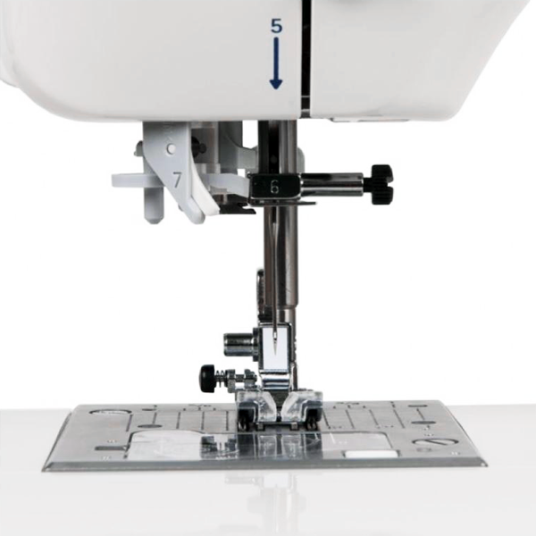 Maszyna wyposażona jest w płynną regulację długości i szerokości ściegu, możliwość szycia podwójną igłą, pozycjonowanie igły, ściegi lustrzane, regulację docisku stopki, dodatkowo płytka ściegowa posiada linie pomocnicze z podziałką. bezpieczny transport zapewni dołączona sztywna walizka.