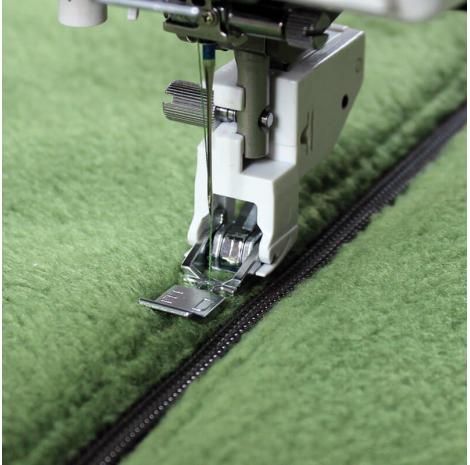 Specjalistyczna płoza, pozwalająca wszywać zamki błyskawiczne korzystając ze stopki z górnym transportem. Budowa stopki pozwala igle na wbijanie się bardzo blisko ząbków zamka, dzięki czemu wszywany jest dokładnie i bardzo estetycznie. Z jej pomocą wszyjesz zamek zarówno do standardowych tkanin, dzianin jak i do skór, skaju, winylu.