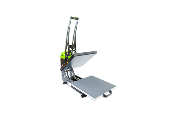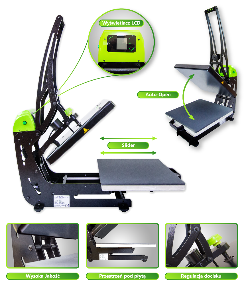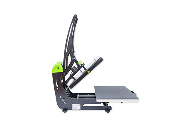 Dzięki mechanizmowi wysuwu, łatwiej jest manipulować przy dolnej płycie. Pracownicy bardzo chwalą ten patent, a efektem jest mniej braków i lepsza wydajność. Prasa posiada podcięcie pod dolną płytą, co umożliwia włożenie dolnej płyty do wewnątrz prasowanej koszulki. Jest to bardzo ważna funkcja ułatwiająca pracę na przykład z koszulkami polo.