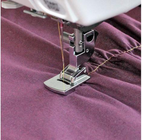 Z tą stopką łatwo ozdobisz sukienkę, bluzkę, firankę, narzutę, zasłonkę, stworzysz też oryginalne dekoracje. Stopka umożliwia bowiem uzyskanie efektownych marszczeń – przede wszystkim na cienkich i delikatnych tkaninach. Wygląd marszczenia zależy także od długości ściegu i naprężenia nici. Im oba parametry są wyższe, tym jest gęstsze marszczenie. Na grubszych materiałach będzie ono delikatniejsze. Osoby, które chcą uzyskać lepszy efekt na bardziej sztywnych tkaninach, powinny zwilżyć je przed marszczeniem. Należy pamiętać o tym, żeby marszczyć jedną warstwę materiału nie ciągnąć jej podczas szycia.