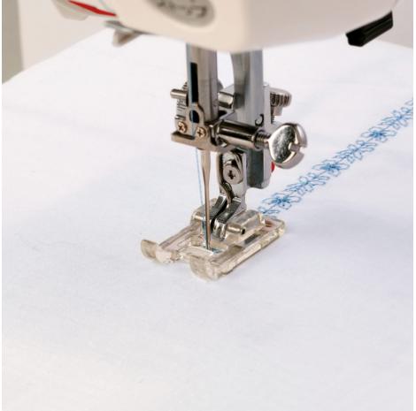 Niezastąpiona stopka przy dekorowaniu ściegami ozdobnymi oraz przy naszywaniu aplikacji. Dzięki zastosowaniu dużej przestrzeni pomiędzy płozami, stopka płynnie przemieszcza się ponad każdym ozdobnym ściegiem, nawet bardzo gęstymi satynowymi, również przy naszywaniu aplikacji. Stopka posiada dwie równoległe linie, wskazujące miejsce, gdzie na tkaninie powstanie ścieg, a więc naszywanie aplikacji jak i dekorowanie może być wykonane za każdym razem bardzo precyzyjnie. Dodatkowo poza naszywaniem aplikacji i tworzeniem idealnych ściegów dekoracyjnych przy pomocy tej stopki, możliwe jest również obrębianie długości dziurek (bez kordu).