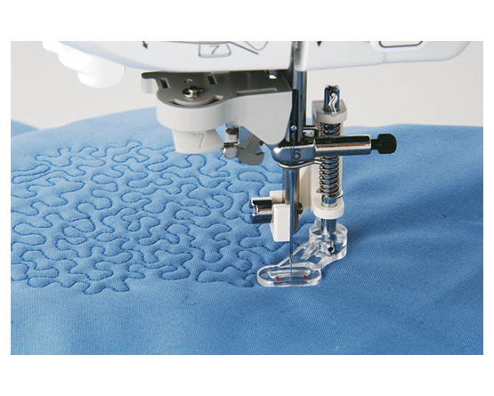Dzięki temu, że jest plastikowa (przezroczysta!) można kontrolować kierunek układania ściegów widząc całość wzoru, który chcemy wyszyć. Z tą stopką pracujemy przy opuszczonych ząbkach w odpowiedni sposób poruszając tkaniną pod igłą.
