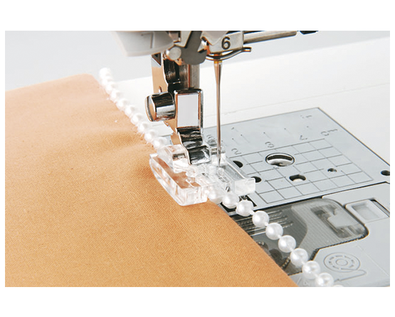 Umożliwia przyszycie pereł lub obszycie zaokrąglonych brzegów o średnicy do 4 mm.