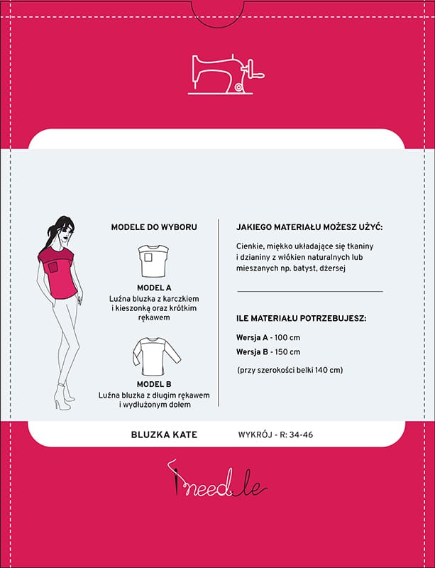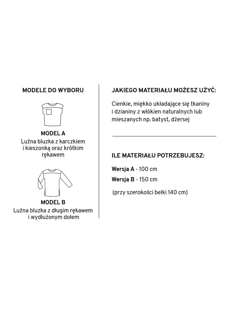 Wykrój „Bluzka Kate” umożliwia uszycie dwóch różnych form bluzek, w zależności od upodobań i potrzeb: