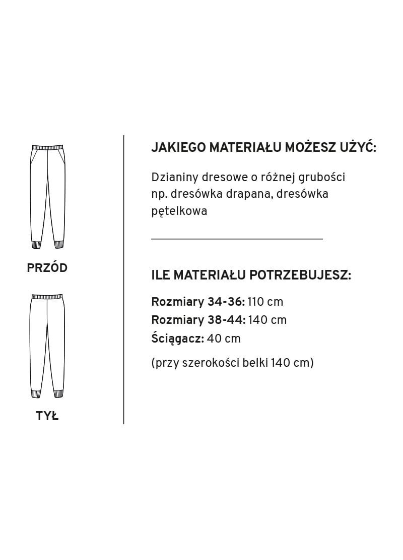 Na podstawie tego wykroju uszyjesz długie spodnie dresowe, noszone obecnie na wszystkie okazje, nie wyłączając eleganckich wieczorów. Wszystko zależy od tkaniny, z jakiej uszyjemy te spodnie i od koncepcji całej kreacji. Spodnie według tego wykroju – w pasie przytrzymuje ściągacz, na biodrach spodnie są lekko dopasowane, nogawki również są swobodnie dopasowane do nogi, po lekkim wymodelowaniu zwężają się ku dołowi i kończą się ściągaczem na kostkach. Tkaninę ściągaczową bez problemu można kupić w sklepach pasmanteryjnych i z tkaninami. Spodnie Demi posiadają wpuszczone boczne kieszenie.