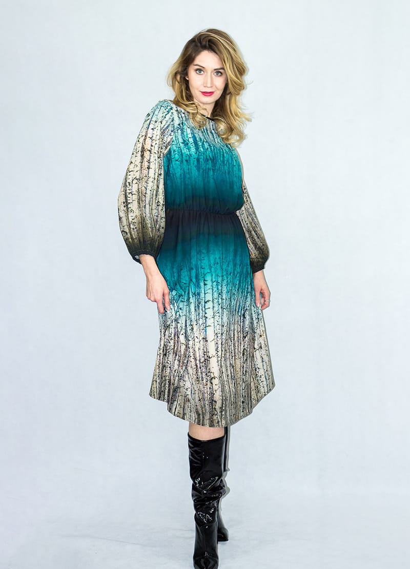 Sukienka jest odcięta w pasie i zmarszczona lekko za pomocą wszytej gumki. Przy szyi sukienka jest wykończona na okrągło, a jej długość oscyluje – a właściwie faluje i kręci się – trochę za kolano.