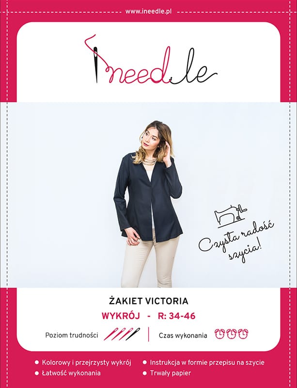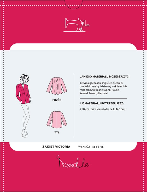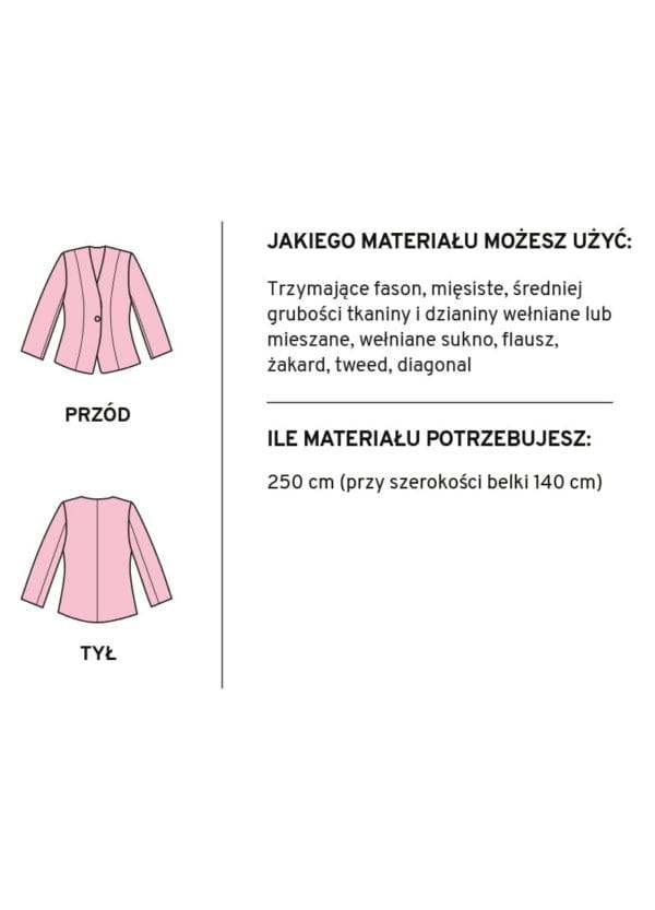 W zależności od materiału: przy grubszym – będzie to żakiet na bluzkę; przy cieńszym – lekki żakiet na letnią sukienkę lub top. Wykrój Victoria poprzez swoją formę podkreśla kobiecą sylwetkę, nadając jej lekkości i zwiewności.